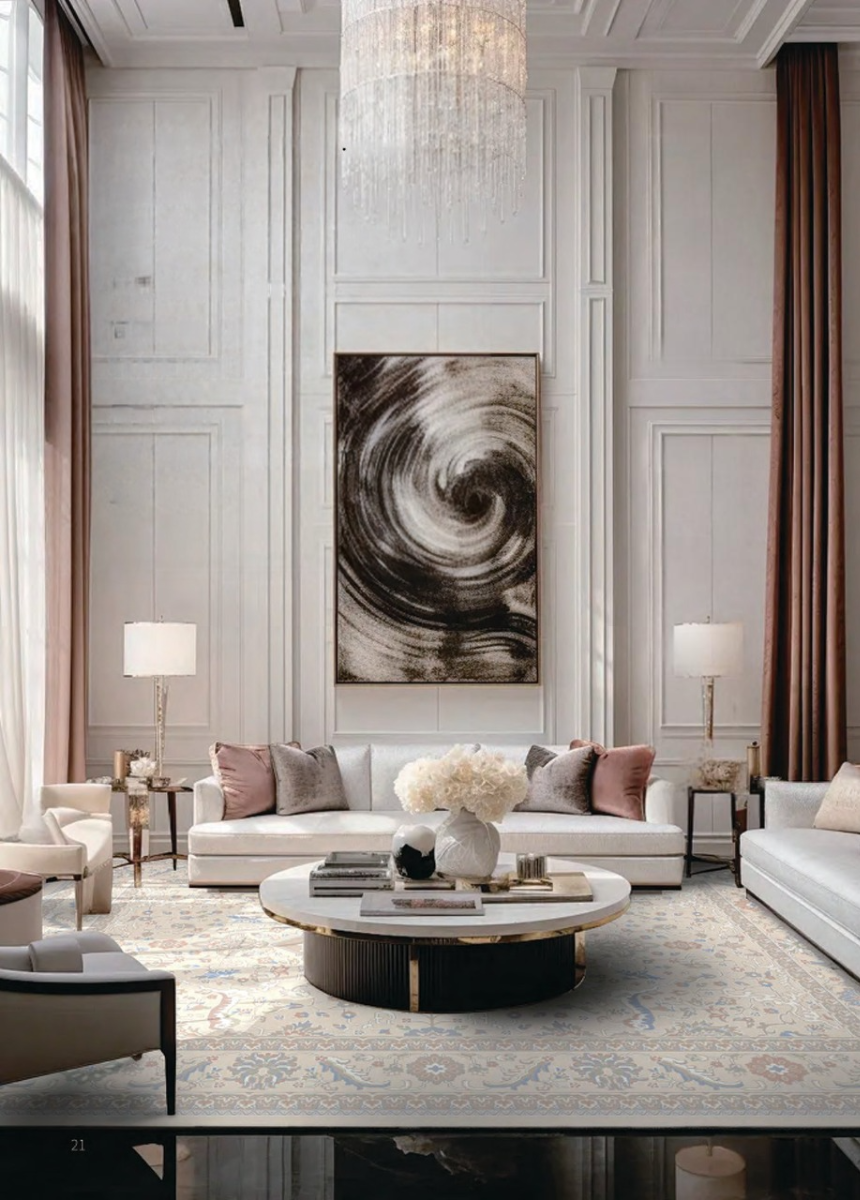 พรมดีไซน์คลาสสิกระดับพรีเมียม วินเทจหรูหราในโทนสีพาสเทลอ่อน เช่น ฟ้า เทา ครีม น้ำตาลอ่อน เหมาะอย่างยิ่งสำหรับห้องโถง ห้องรับแขก หรือบ้านที่ต้องการความอลังการอย่างมีรสนิยม มีให้เลือกหลายขนาด