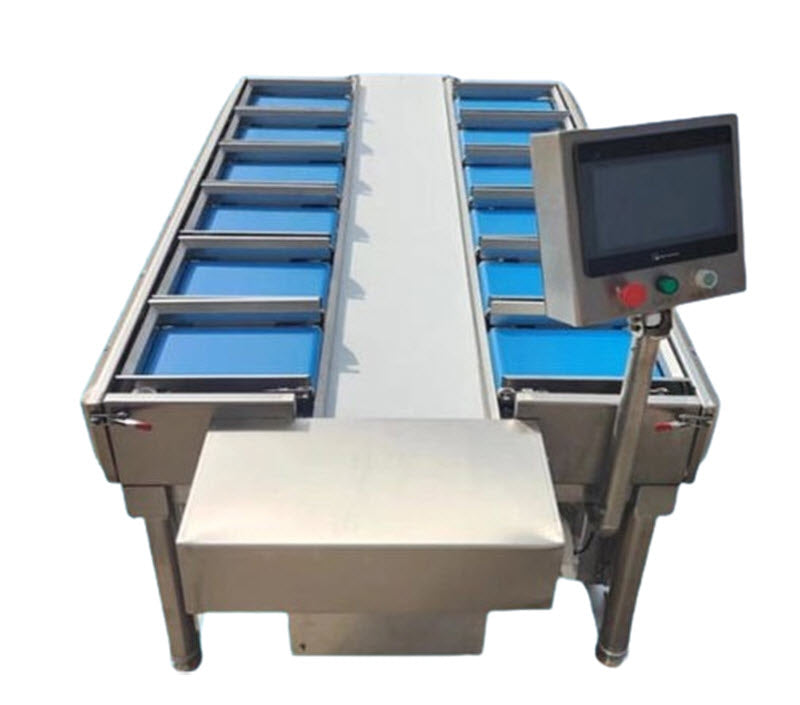 เครื่องชั่งอัตโนมัติ รุ่นหลายตำแหน่ง สำหรับชั่งน้ำหนักอาหารแห้ง เช่น มันหวาน ไส้กรอก หน่อไม้ และปลาหมึก