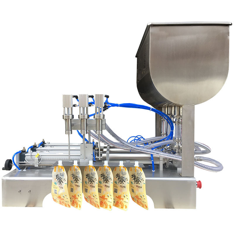 เครื่องบรรจุของเหลวพร้อมถังกวน 3 หัวจ่าย Multi-head small pneumatic paste bag water tomato pulp honey laundry liquid -